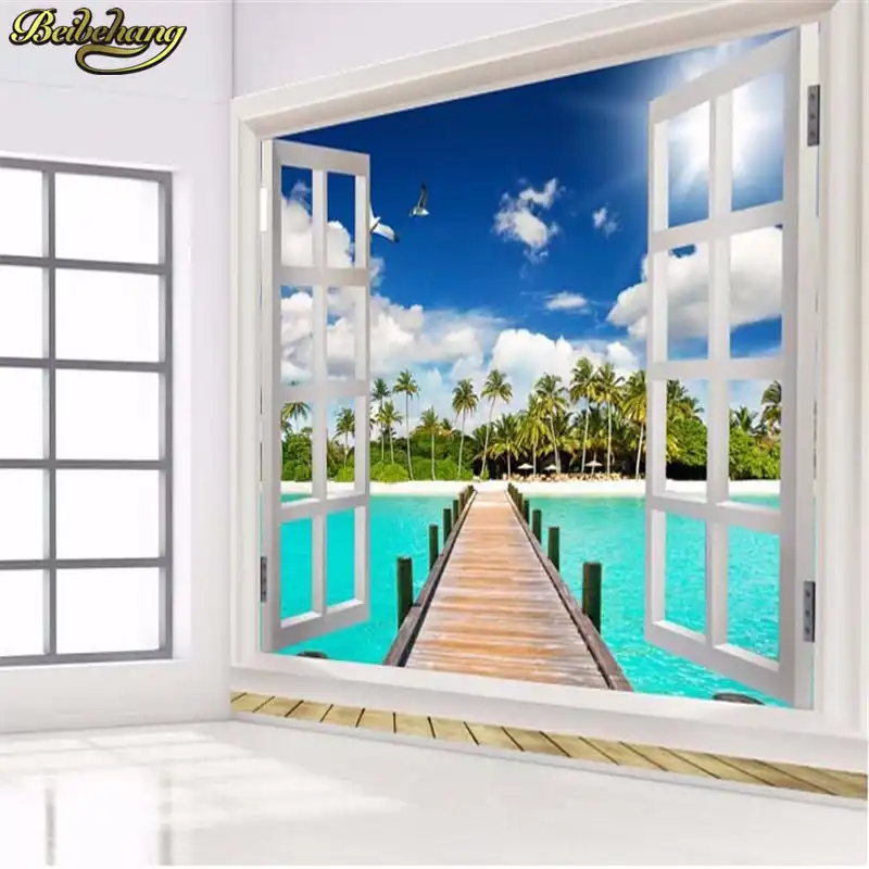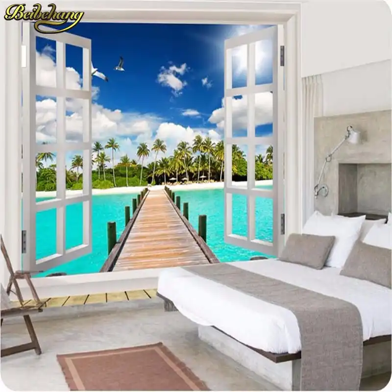 Beibehang Photo Wallpaper 3d Flooring Wall Paper Nature Background Beach Ocean View Window Blue Sky Clouds Large Mural Painting Floor Wall Paper Photo Wallpaper 3dphoto Wallpaper Aliexpress